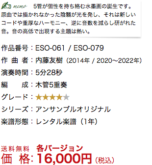 ホーム > レンタル楽譜一覧 > アンサンブルオリジナルⓈ > 水墨画三景にみる白と黒の陰翳〜木管五重奏のための / SUIBOKUGA -for Woodwind Quintet