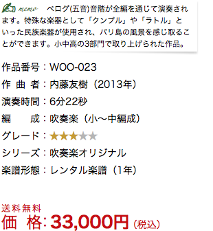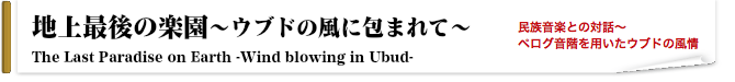 この《地上最後の楽園〜ウブドの風に包まれて〜》は、インドネシア・バリ島をイメージし2013年に作曲いたしました。自然と、人間が放つ熱を表現するために「クンプル」や「ラトル」といった民族打楽器を入れてあります。「クンプル」は、中型の吊り下げゴングになります。「ラトル」は、器の外に木の実をつけて鳴らす楽器です。無い場合は「通常のゴング」や「マラカス」等で代用ください。さて、日本とバリ島は、どこか共通した世界観があるように感じます。風景や人情もそうですが、音階もその一つです。バリ島では、ペログ音階「C・D♭・E♭・G・A♭」を用いた伝統的な民族音楽「ガムラン」がございます。このペログ音階を「G・A♭・B♭・D・E♭」に移調した五音音階が、全編に通して出てきます。
