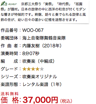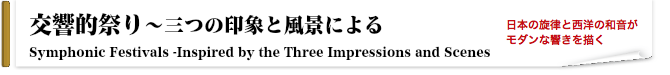 この《交響的祭り~三つの印象と風景による》は、海上自衛隊舞鶴音楽隊の委嘱により2018年に作曲いたしました。京都三大祭りとして有名な「葵祭」「時代祭」「祇園祭」を題材にし、それぞれの祭りから受ける印象や風景、時代背景を綴りました。鴨川に並ぶ川床、夏の暑い風を受け揺れる提灯、凛とした空気を感じる寺院や建造物。全てが日本の伝統的な風景であり、長い歴史を繋いだ先人達の力強さを感じました。その中に明治時代に建てられたコンクリート造の近代建築が並び、日本の美と西洋の文化が合さりモダンな景観を写していました。祭りという大きな題材を軸に、日本の風情を織り交ぜ完成させました。